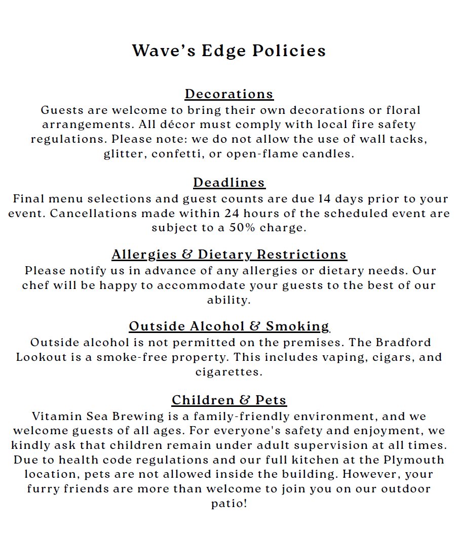 THE WAVE ’S EDGE EVENT SPACE BAR IS EQUIPPED WITH A FOUR TAP DRAUGHT SYSTEM AND NUMEROUS CANNED BEER, SELTZER, AND NON-ALCOHOLIC OPTIONS.